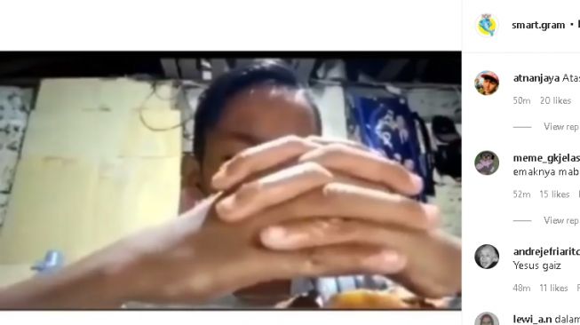 Dalam video yang diunggah oleh akun Instagram @smart.gram pada Selasa (2/2/2021) tersebut, tampak si bocah sedang membuat konten video. Ia terlihat mengawali konten tersebut dengan memanjatkan doa sebelum makan.